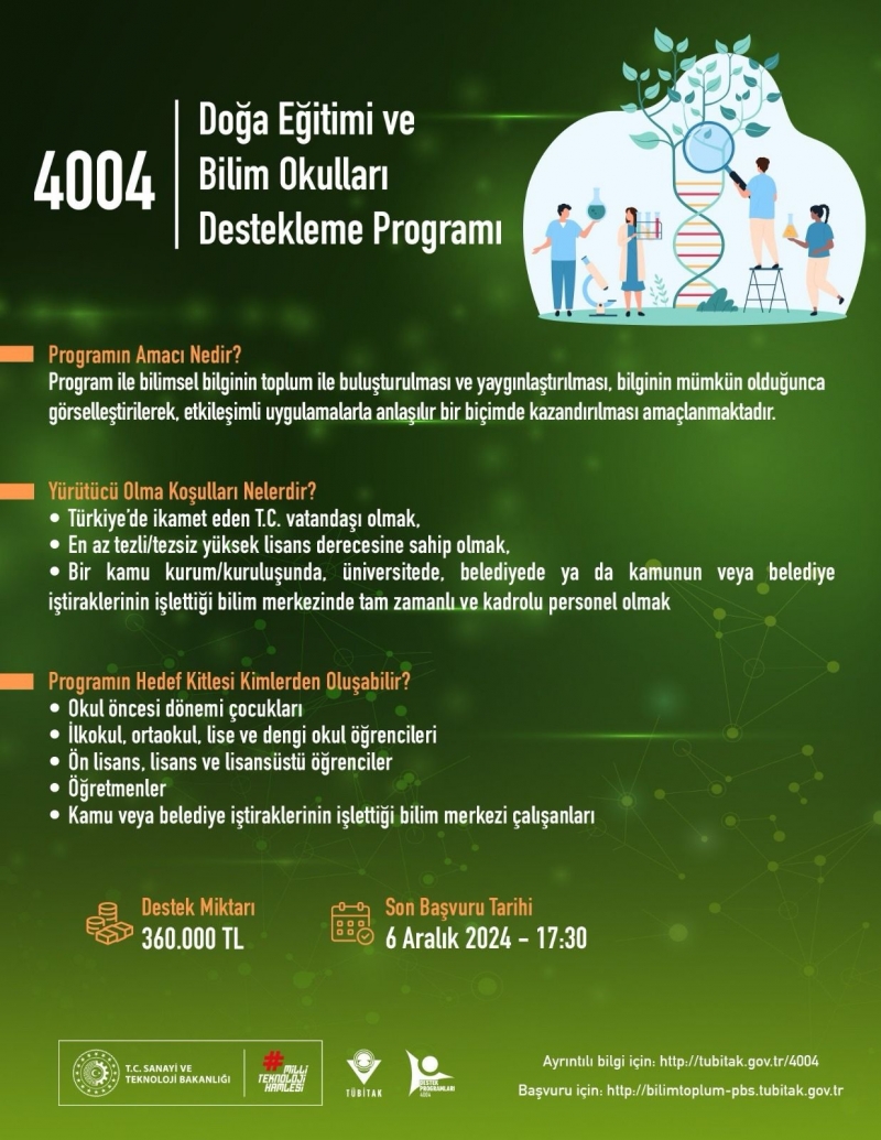 4004-Doğa Eğitimi ve Bilim Okulları Destekleme Programı, doğa, bilim ve teknoloji konularında farkındalık yaratmak amacıyla hedef kitlenin bilimsel konu, kavram ve süreçleri gözlem ve uygulamalarla anlamasına olanak sağlayan ve belirli bir program dahilinde gerçekleştirilen etkinlikler, konaklamalı veya konaklamasız eğitim programlarıdır.