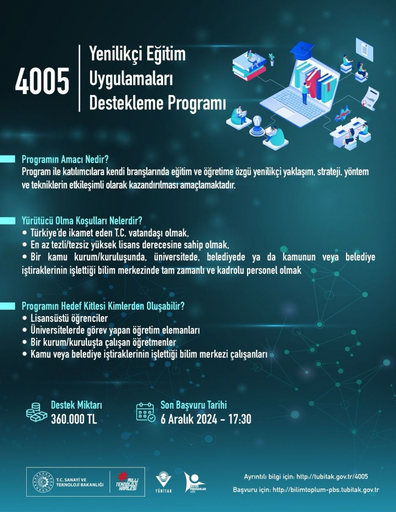 4005-Yenilikçi Eğitim Uygulamaları Destek Programı kapsamında lisansüstü öğrenciler, üniversitelerde görev yapan öğretim elemanları, bir kurum ve kuruluşta çalışan kadrolu öğretmenler ve kamu ve belediye iştiraklerinin işlettiği bilim merkezleri çalışanlarına, kendi branşlarında eğitim ve öğretime özgü yenilikçi yaklaşım, strateji, yöntem ve tekniklerin etkileşimli olarak kazandırılması, kullanılması ve yaygınlaştırılması amaçlanır.