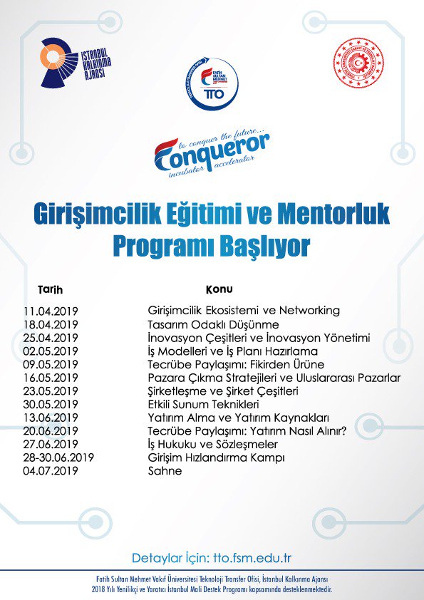 Conqueror Girişimcilik Eğitimi ve Mentorluk programımız 11 Nisan 2019 10:00'da ilk eğitimimiz ile Topkapı Yerleşkemiz'de başlıyor.