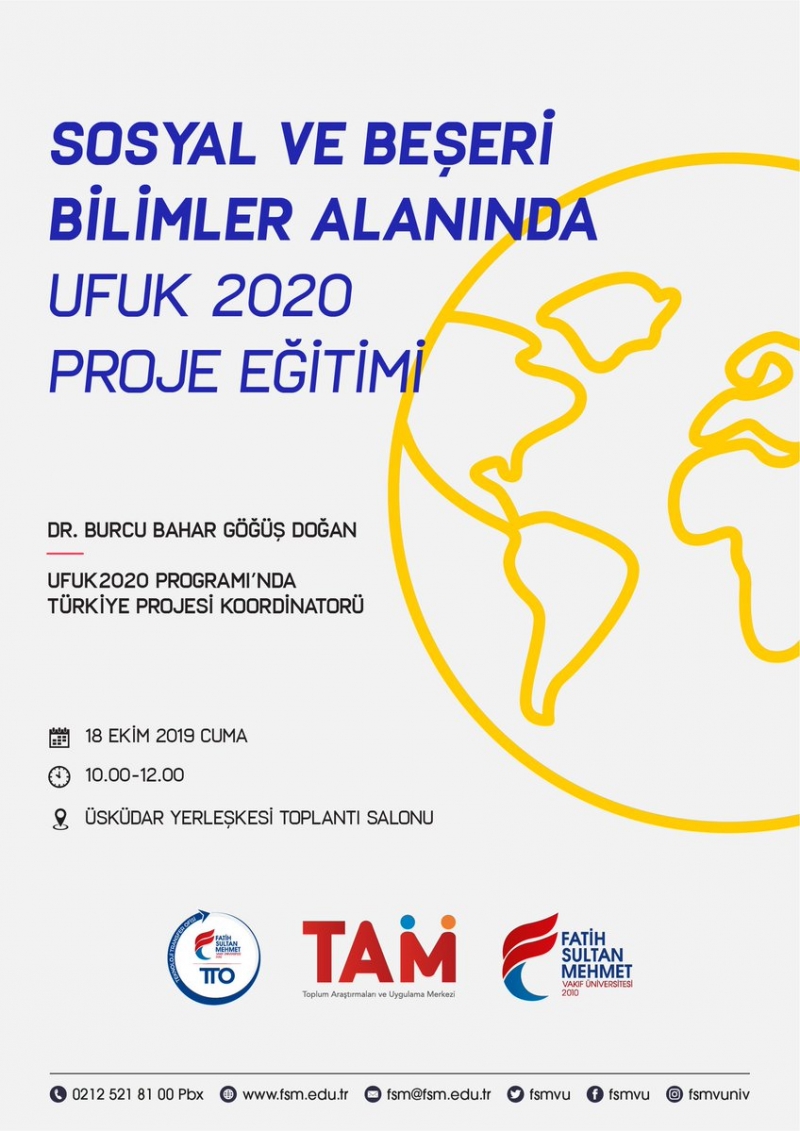 Proje Geliştirme ve Yönetim Birimimiz ile Toplum Araştırmaları Merkezi ortaklığında 18 Ekim 2019 tarihinde Üsküdar Yerleşkesi Toplantı Salonunda “Sosyal ve Beşeri Bilimler Alanında Ufuk 2020 Proje Eğitimi” gerçekleştirilecektir.