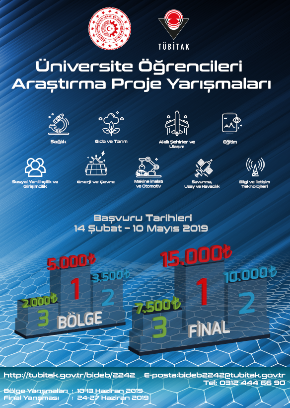 TÜBİTAK Üniversite Öğrencileri Araştırma Proje Yarışmaları 2019 Yılı Çağrısı, ön lisans ve lisans öğrencilerinin, ülkemizin ihtiyaç duyduğu tüm alanlarda bilimsel çözümler üretmelerini ve bu doğrultuda bilgi ve becerilerini geliştirmelerine yönelik olarak projeler geliştirmelerini teşvik etmektedir.